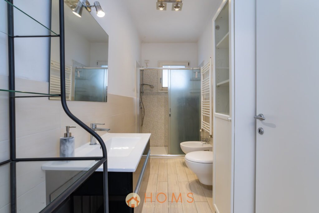 Al primo piano troviamo una luminosa e spaziosa zona giorno con cucina con aria condizionata. L’immobile presenta una pavimentazione in laminato nella zona giorno e notte, invece nei bagni presenta una pavimentazione in gres porcellanato. Completa il piano un ampio bagno con doccia e disimpegno con mobile/ripostiglio con lavanderia.